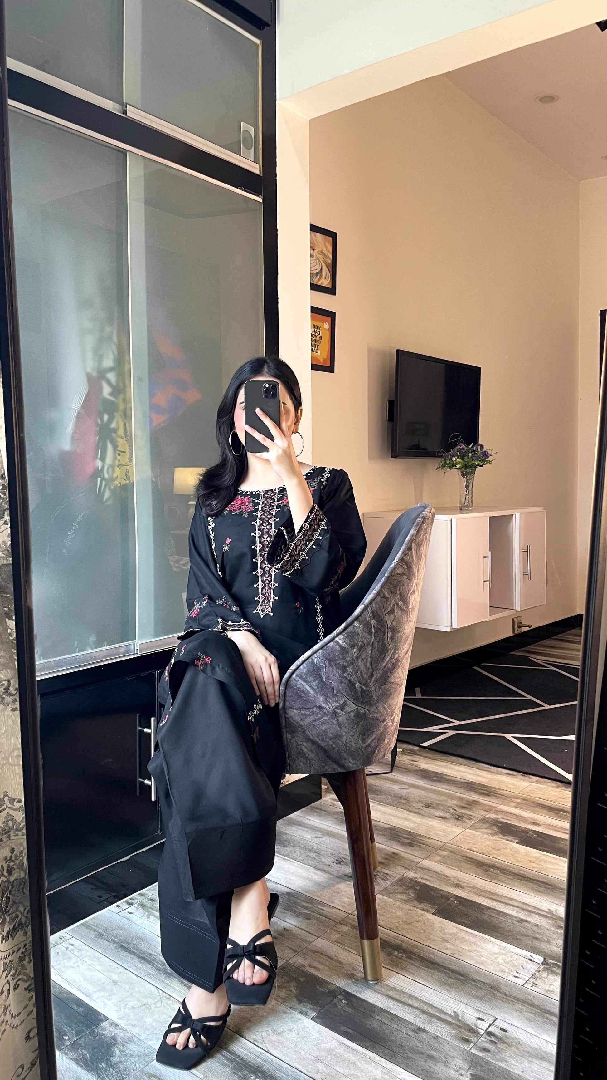 Premium elegance redefined in our latest 2PC Multi Black Embroidered Farshi set from the Anchal Winter Collection. Featuring intricate embroidery on premium lilen fabric paired with a statement farshi salwar, this outfit blends tradition with bold sophistication. A must-have for your seasonal wardrobe—timeless, classy, and effortlessly chic.